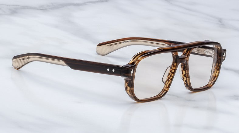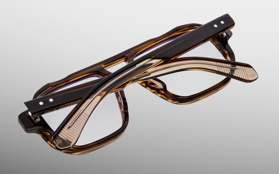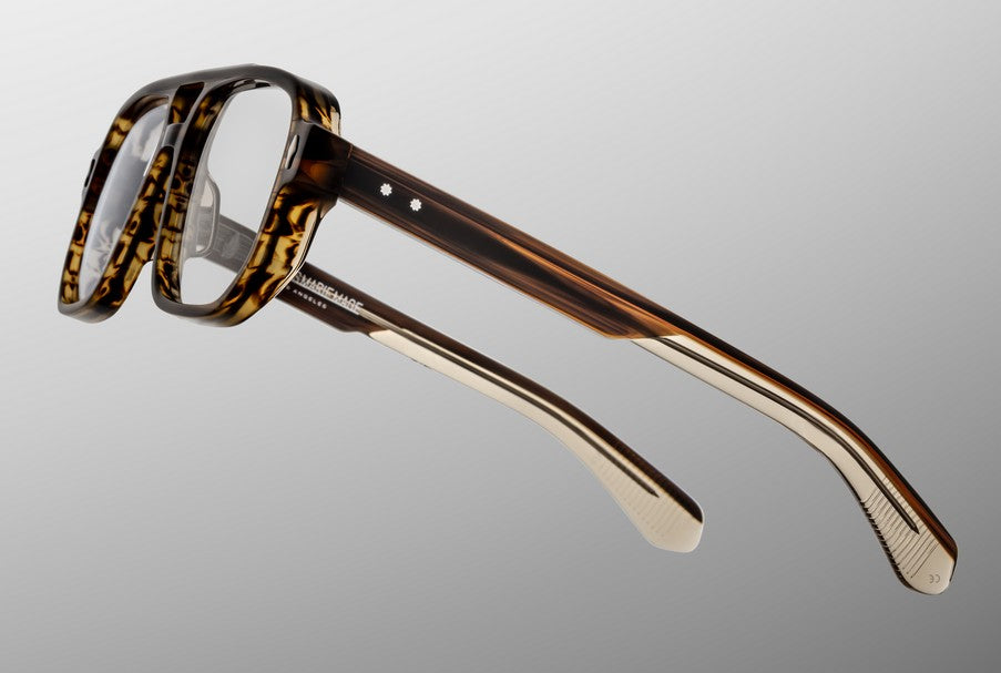 Brown 8mm cured cellulose acetate frame custom double laminated acetate temples featuring precious metal hardware and brown lenses
