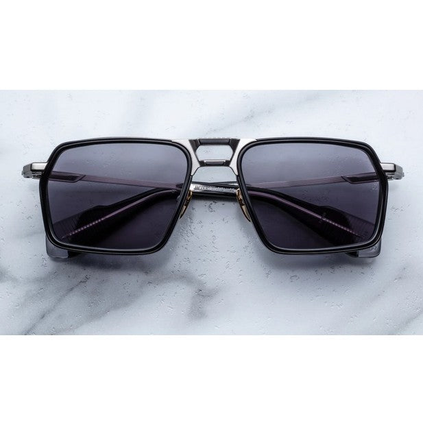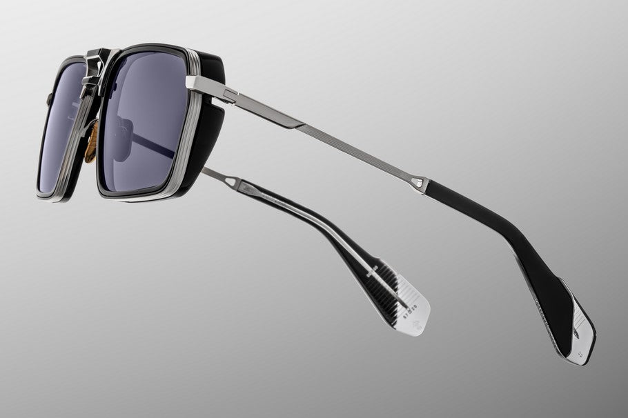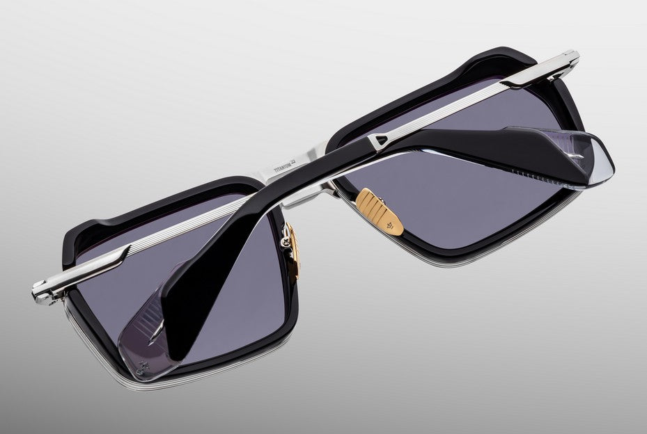 Silver 100% beta titanium frame with 11mm black cured cellulose acetate inserts and grey lenses