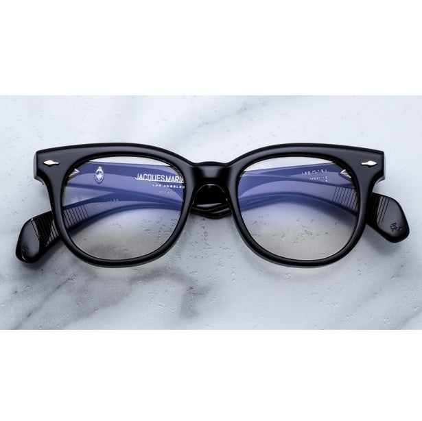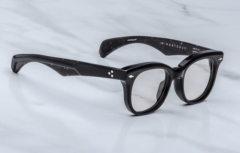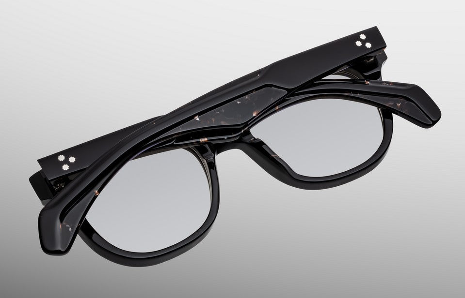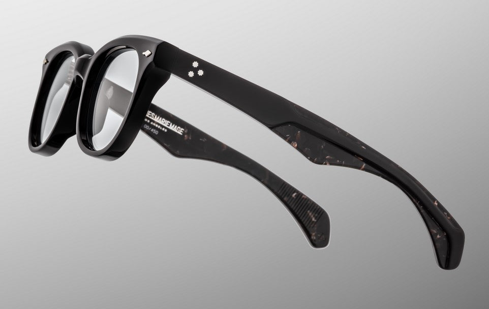 Black 10mm cured cellulose acetate frame with custom double-laminated acetate temples featuring precious metal hardware and light brown lenses