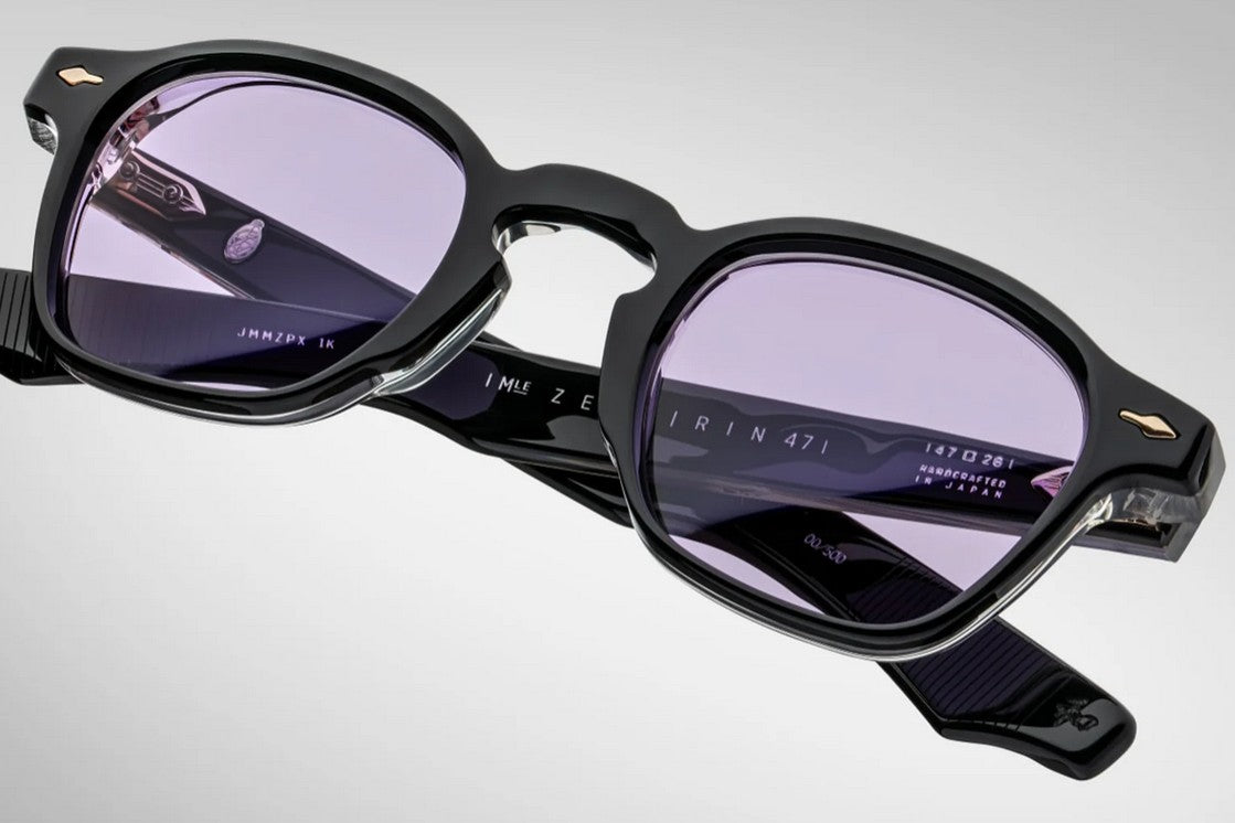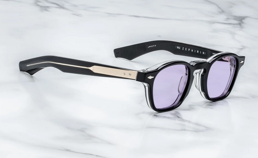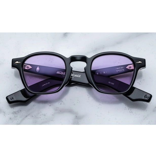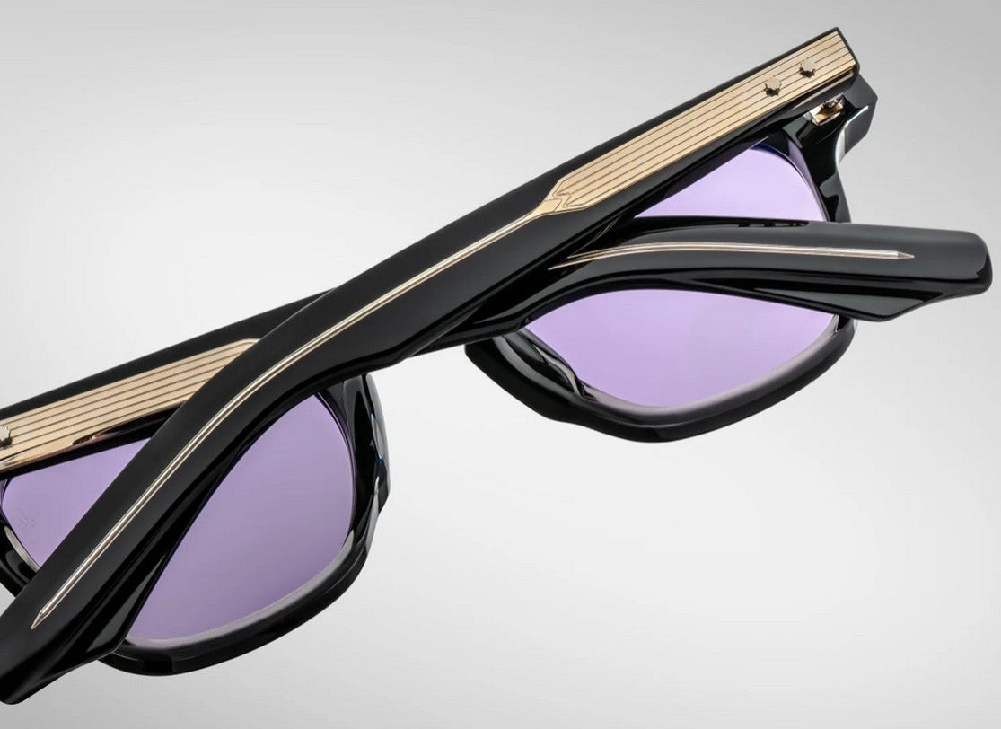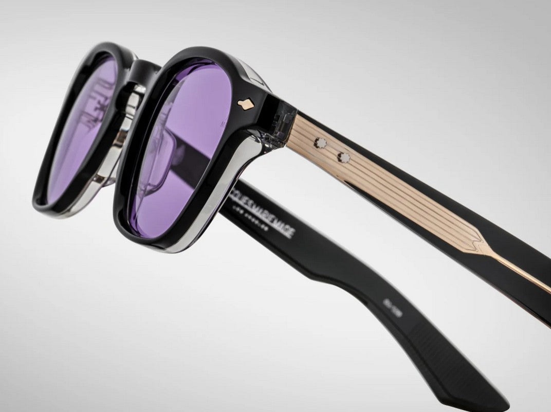 BLACK 10MM CURED CELLULOSE ACETATE FRAME WITH CUSTOM ACETATE TEMPLES FEATURING PRECIOUS METAL HARDWARE AND PURPLE LENSES
